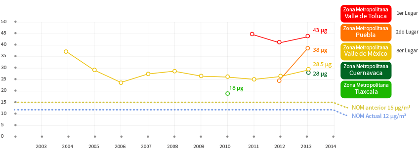 Fuente: ZMVM, ZMVT, INECC, 2014. Zona metropolitana de Puebla: Secretaria de Desarrollo Rural y Sustentable 2014. Tlaxcala: Herrera, 2014. Datos preliminares del Proaire Cuernavaca: 28 mg/m³ estimación a partir de imágenes de Satélite Modis OECD, 2014